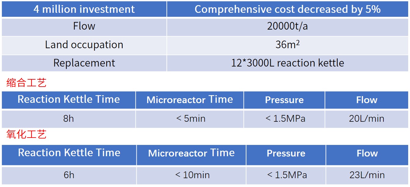 The 3D printing micro reaction equipment independently developed by ZSMR. realizes automatic and continuous production of alcohol aldehyde condensation and oxidation, with a large amount of production, reaching a flux of 20 L / min. Combined with Zheda central control DSC technology, it realizes one key remote interlocking control, accurate control of multiple pumps according to proportion and gradient temperature control in multiple temperature ranges. In this project, the plant area required for production is reduced to 10% of the original; The dependence of production on technicians and operators is greatly reduced; The comprehensive cost decreased by 10%.